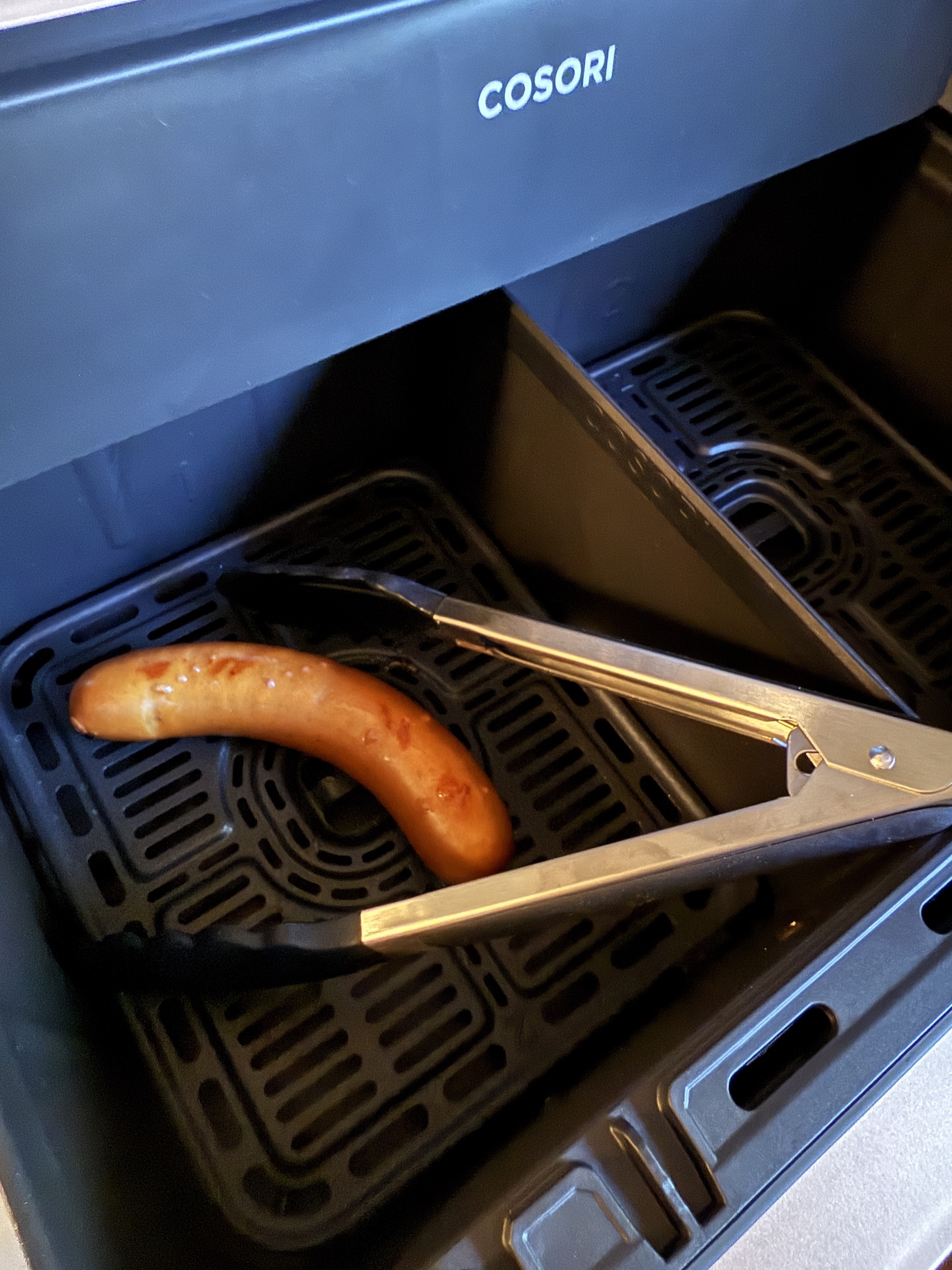 Amerikanska Cosori har ett stort utbud av köksapparater i hemlandet medan vi i Skandinaven får nöja oss med de populäraste airfryer-modellerna. Den nya importören har dock börjar ta in några andra typer av apparater så det kanske är på väg att ändras. Dual Blaze TwinFry levereras med en praktisk grilltång med silikongrepp, samt förutom instruktionsboken en mer pedagogisk snabbguide. Man kan även skanna en QR-kod för recept, men i skrivande stund fungerade inte de skandinaviska sidorna. Som tillbehör finns en trådkorg för när man behöver extra mycket luftgenomströmning.