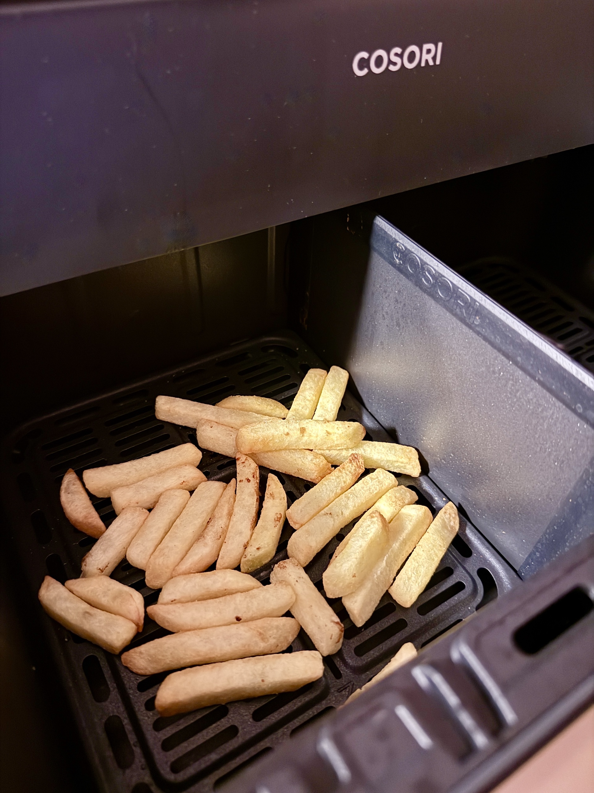 Cosori Dual Blaze TwinFry känns som en genomtänkt apparat. Korgen är rejäl och de två halvorna ordentligt separerade och allt kan diskas i maskin. Touchpanelen är lättbegriplig och vi gillar att man väljer tillagningsmetod snarare än livsmedel med snabbknapparna. Ännu enklare blir det med appen där man kan programmera om knapparna, förutom att man kan följa tillagningen från soffan. Uppvärmningen är snabb och vi blev nöjda med resultatet av matlagningen.