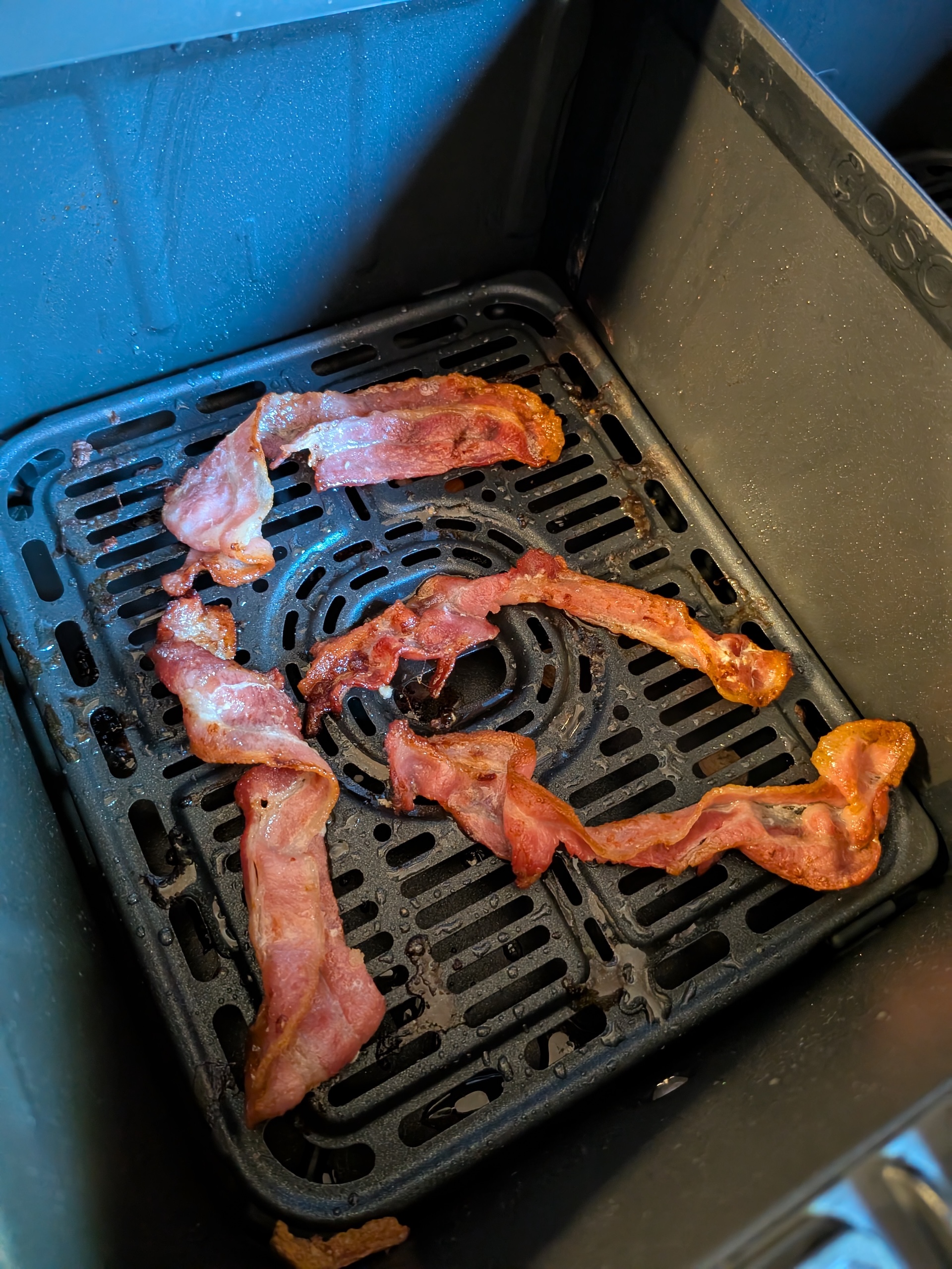Standard i airfryerläget är 200 grader i 20 minuter men som sagt kan man själv ändra det. Den ena korgen nådde 180 grader på 2 min 40 sek, vilket är snabbt, men fortsatte sedan klättra till 190 grader innan den började pendla mellan detta och 176 grader. Den andra korgen nådde 175 grader efter 3 min 20 sek och höll sig där ett par minuter. Efter ett tag stabiliserade sig dock båda korgarna strax över 180 grader så de får ändå godkänt. I vardagligt bruk känns den förutsägbar så vi hade inga problem att få bacon, korv och äggrätter precis som vi ville ha dem.
