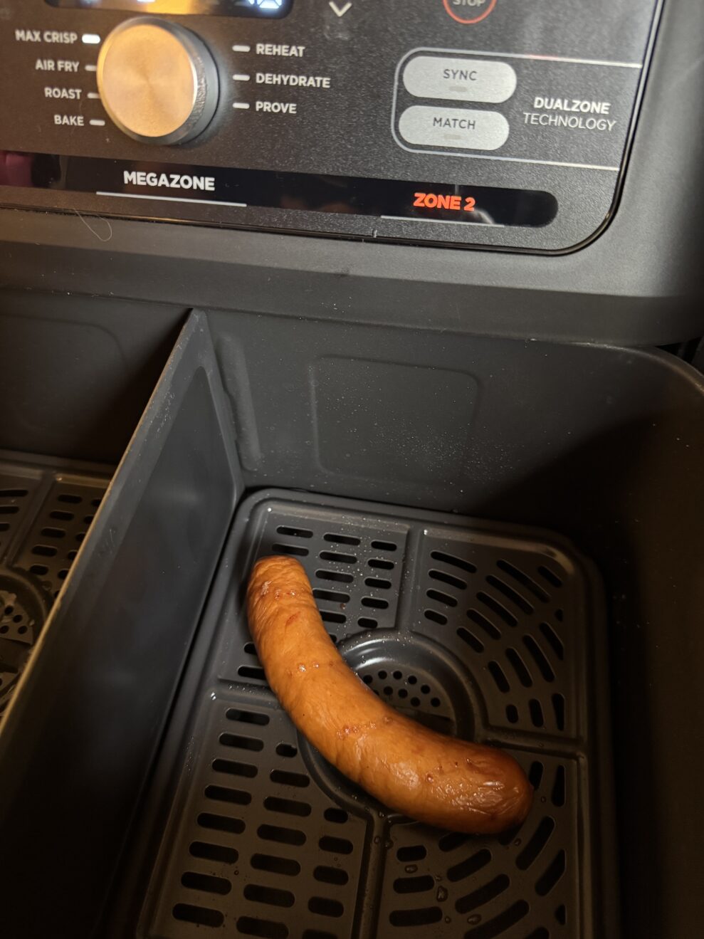 I airfry-läget är standardinställningen 200 grader och 20 minuter men det går ganska snabbt att ändra. Under uppvärmningen skiljer det hela 30 grader mellan korgarna vilket är lite oroande. Korg 2 når 180 grader på godkända 3 min 21 sek och pendlar sedan mellan 175 och 180. Korg 1 däremot når 170 grader på medelmåttiga 4 min 10 sek och håller sig sedan där resten av tiden. Det är ingen katastrof men nog är det märkligt att det skiljer mellan korgarna. I praktiken fungerar det dock utmärkt och vi hade inga problem med allt från bacon och äggrätter till korv och gratänger.