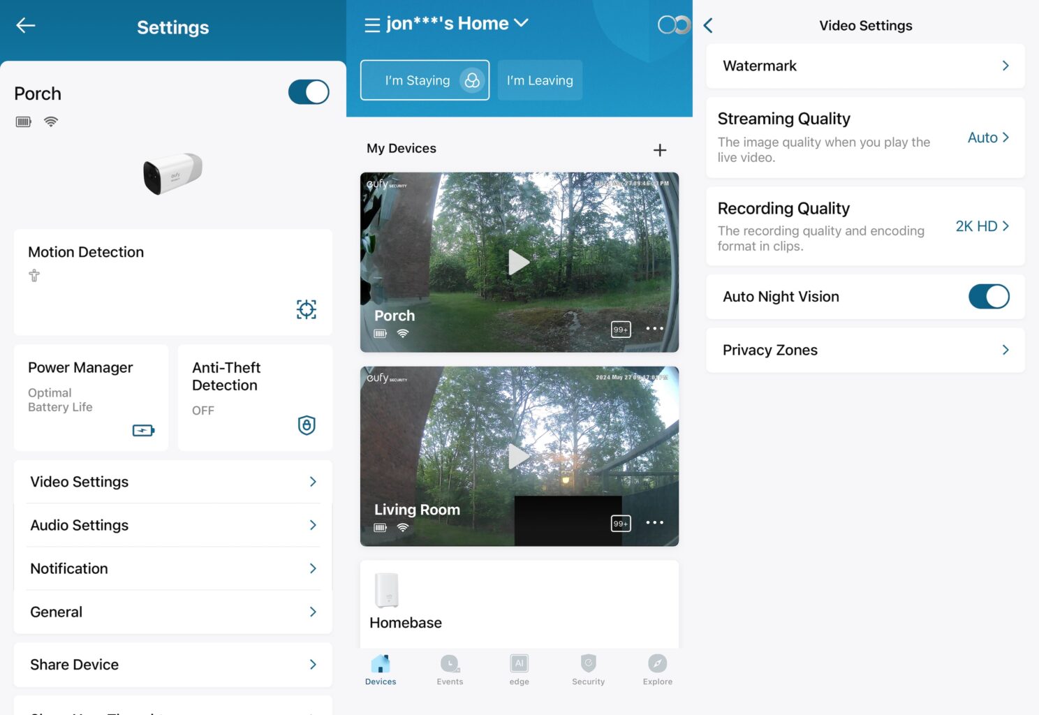 Från appens hemskärm ser man direkt installerade kameror och deras status. Här kan man även sätta dem i hemma- eller bortaläge. Vi gillar också att hubben lätt kan installeras i Apple Homekit, anslutas till Google Home, eller styras med Amazon Alexa. Därmed kan hemma- och bortaläge automatiskt avgöras av geofencing när mobilen lämnar eller anländer till hemmet.