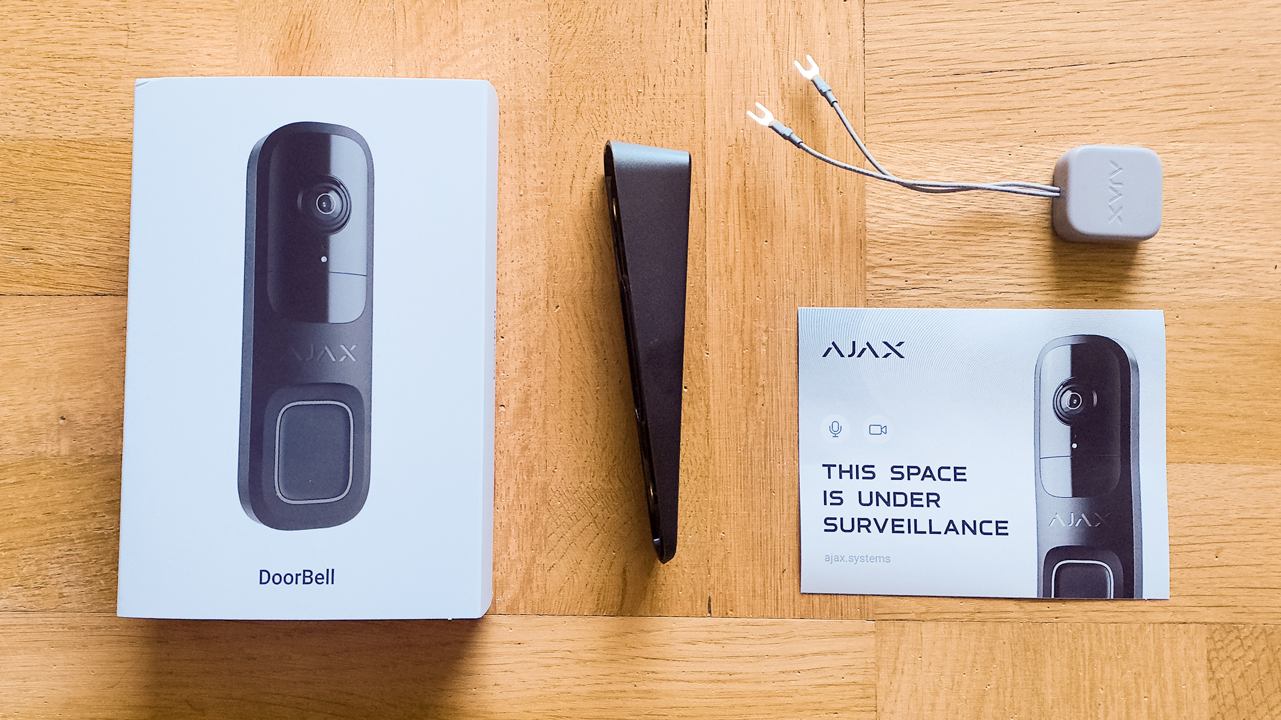 Ajax Doorbell levereras med diverse skruvar, monteringsadaptrar för vinkling vänster/höger 25 grader samt upp/ner 10 grader, Bellkit (för anslutning till existerande ringklocka) samt ett klistermärke med texten ”This space is under surveillance”.