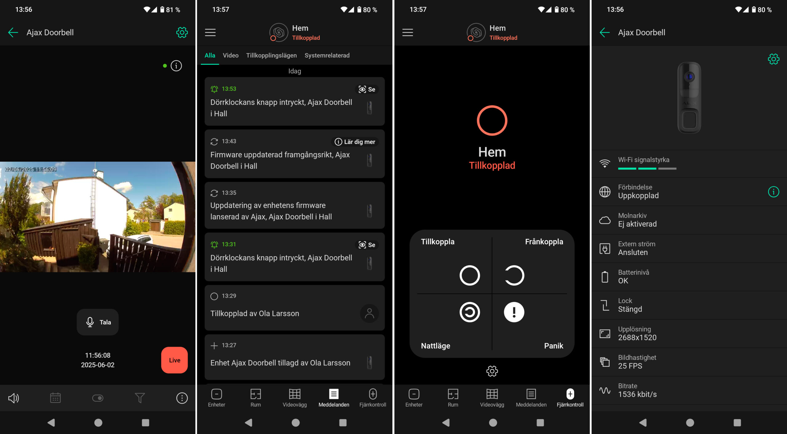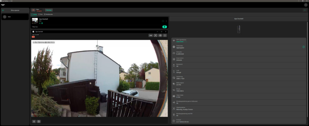 Som en parentes kan nämnas att undertecknads installerade Netatmo Smart Video Doorbell (som låg i samma prisklass innan den slutade tillverkas) tar cirka tre sekunder på sig från det att någon trycker på knappen till det att aviseringen kommer i mobilen, och när man klickar på aviseringen tar det cirka tre sekunder innan man kan se vem som står vid dörren. Ajax Doorbell är alltså betydligt snabbare.