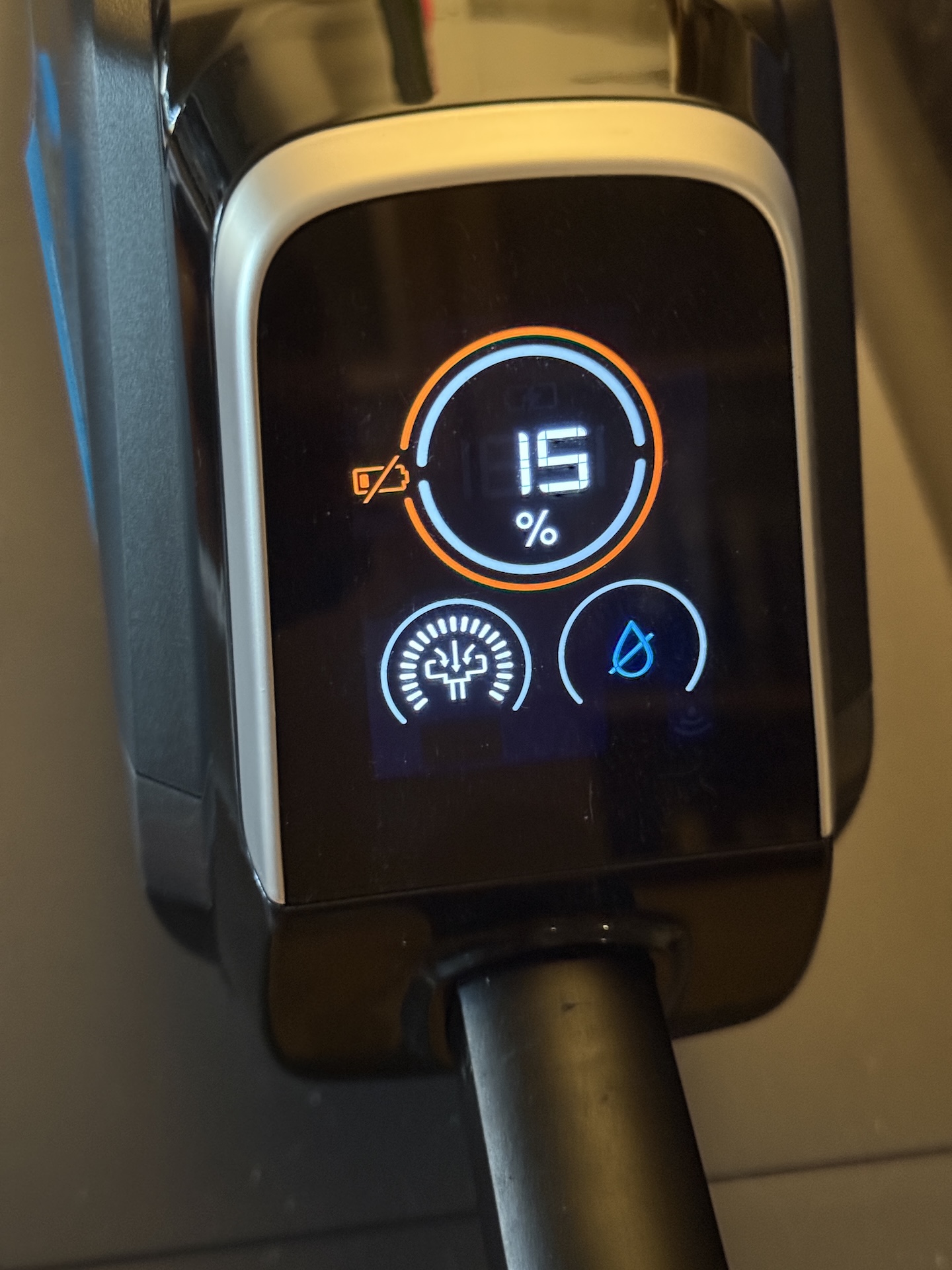 Trevligt nog har Omniforce en färgskärm som visar återstående batteri, sugstyrka, om moppning är aktiverat samt varningar för tom vattentank och full smutsvattentank. Skärmen roterar efter läge så att siffrorna alltid är rättvända. Hanteringen sköts med tre knappar. Av/på, moppning eller ej samt sugstyrka. Dessutom finns en knapp på annan plats för att starta rengöringsfunktionen.