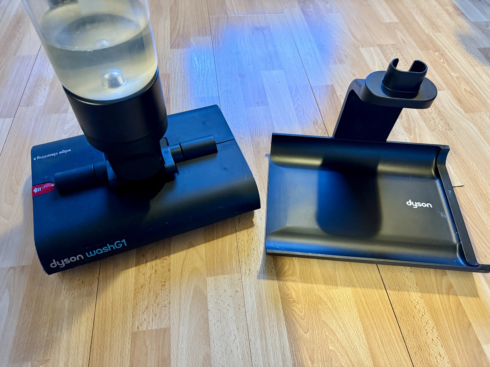 Några tillbehör är synd att tala om då det bara handlar om ett ställ där man även kör rengöringscykeln. Laddaren pluggar man in i stället och när man hänger WashG1 på det så laddas den. Batteriet är löstagbart vilket får oss att tro att det går att köpa ett nytt när det börjar tappa kapacitet, eller ha ett extra om man har ett stort hem. Vi har däremot inte hittat det i Dysons shop, trots att i princip alla andra utbytbara delar finns där. Att de finns är dock ett stort plus.