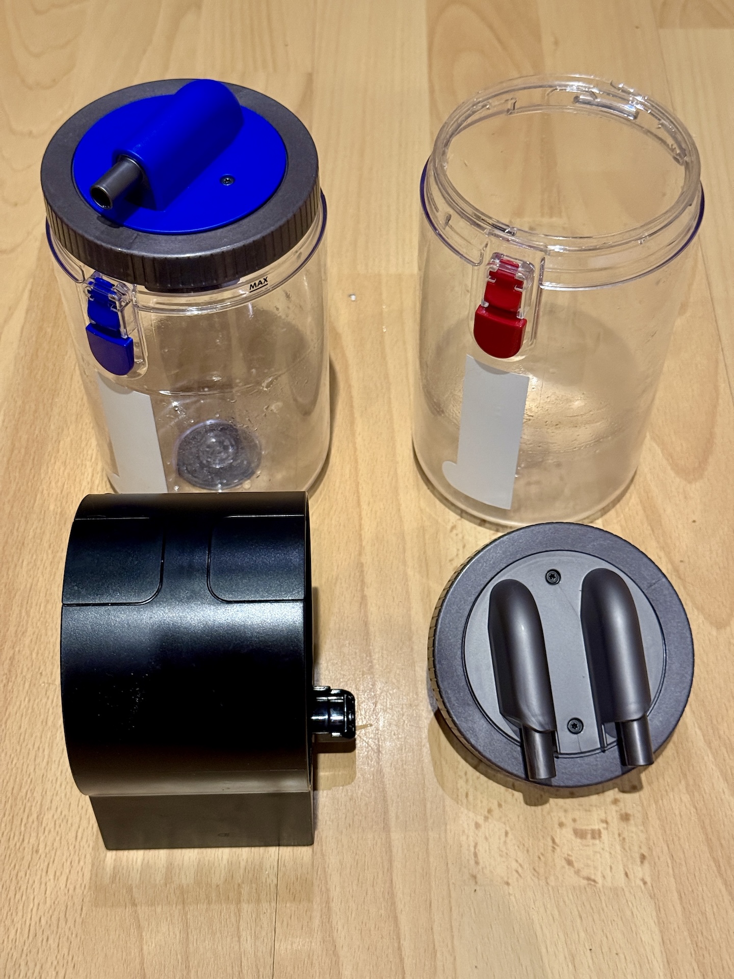 Innan man sätter i gång fyller man vattentanken genom att knäppa loss hela tankmodulen från skaftet. De två tankarna lossas enkelt med varsin knapp och locken skruvas av. En lätthanterlig och funktionell lösning även om vi är lite tveksamma till om all plast kommer att hålla i längden. Dyson menar att man kan ha lite rengöringsmedel i vattnet så länge det inte löddrar.