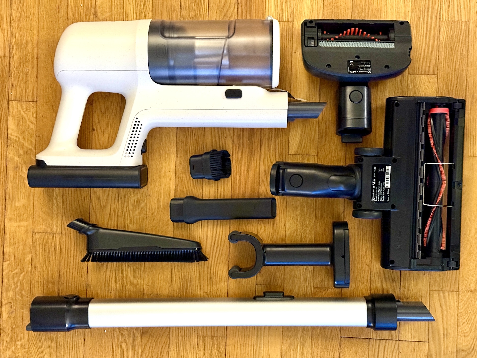 I kartongen hittar vi, förutom det stora motoriserade golvmunstycket, ett smalt fogmunstycke för trånga utrymmen som element, en liten borste för att damma små ytor samt en stor borste för större känsliga ytor. Samt faktiskt ett motoriserat munstycke med roterande borste för möbler. Det är ett måste om man har husdjur som hårar ner soffor och sängar, och något som faktiskt saknades till den dyrare modellen. Dessutom en laddare samt ett enkelt väggfäste. Ett nedköp från den dyrare modellens utmärkta golvställ.