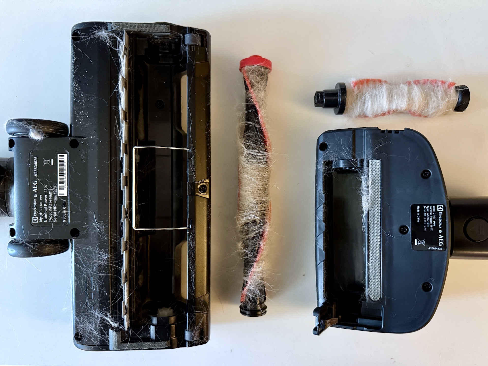 Vi är positivt överraskade av motormunstycket. De brukar annars ha problem med att vara effektiva både på hårda golv och på mattor. Men det blev knappt ett dammkorn kvar på golvet och mattan blev som ny, trots att vi låtit katterna håra ner den lite extra inför testet. Som ett av få munstycken vi testat så fastnade det dessutom inte i vår korthåriga matta. Ska man klaga på något så är det att mycket av håret faktiskt fastnar i borsten. Där har många konkurrenter lösningar för att minimera trasslet. Lyckligtvis är det bara två handgrepp för att lossa borsten och ta loss håren manuellt. LED-lampan är bättre än ingenting men lyser inte upp damm på samma effektiva sätt som Dysons laser.
