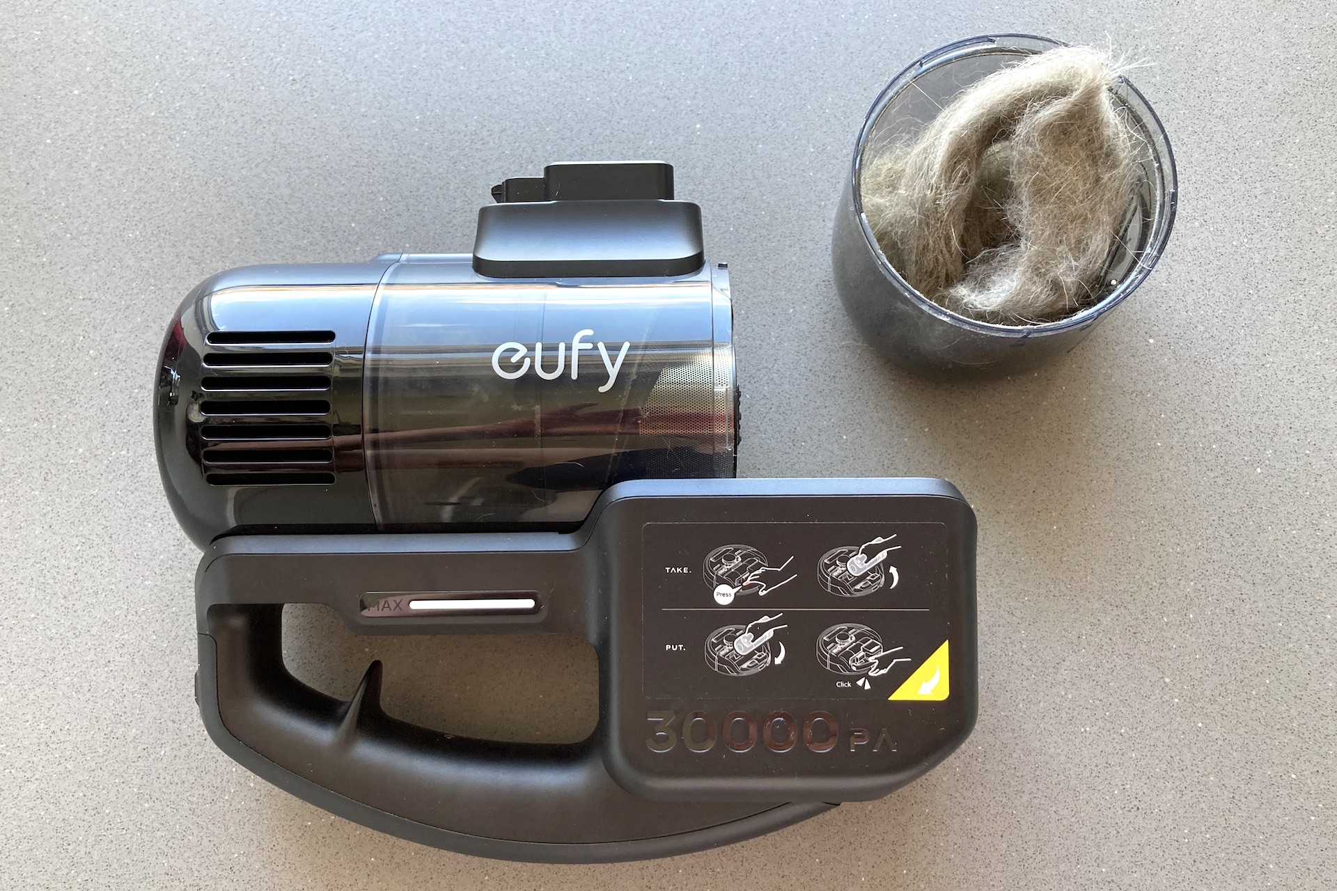 Eufy E20 tog upp katthåret i min mammas möbler, men mycket fastnade i borsten och måste tas bort för hand. Här rekommenderar jag i stället Shark Stratos, som vi testade i slutet av 2024.