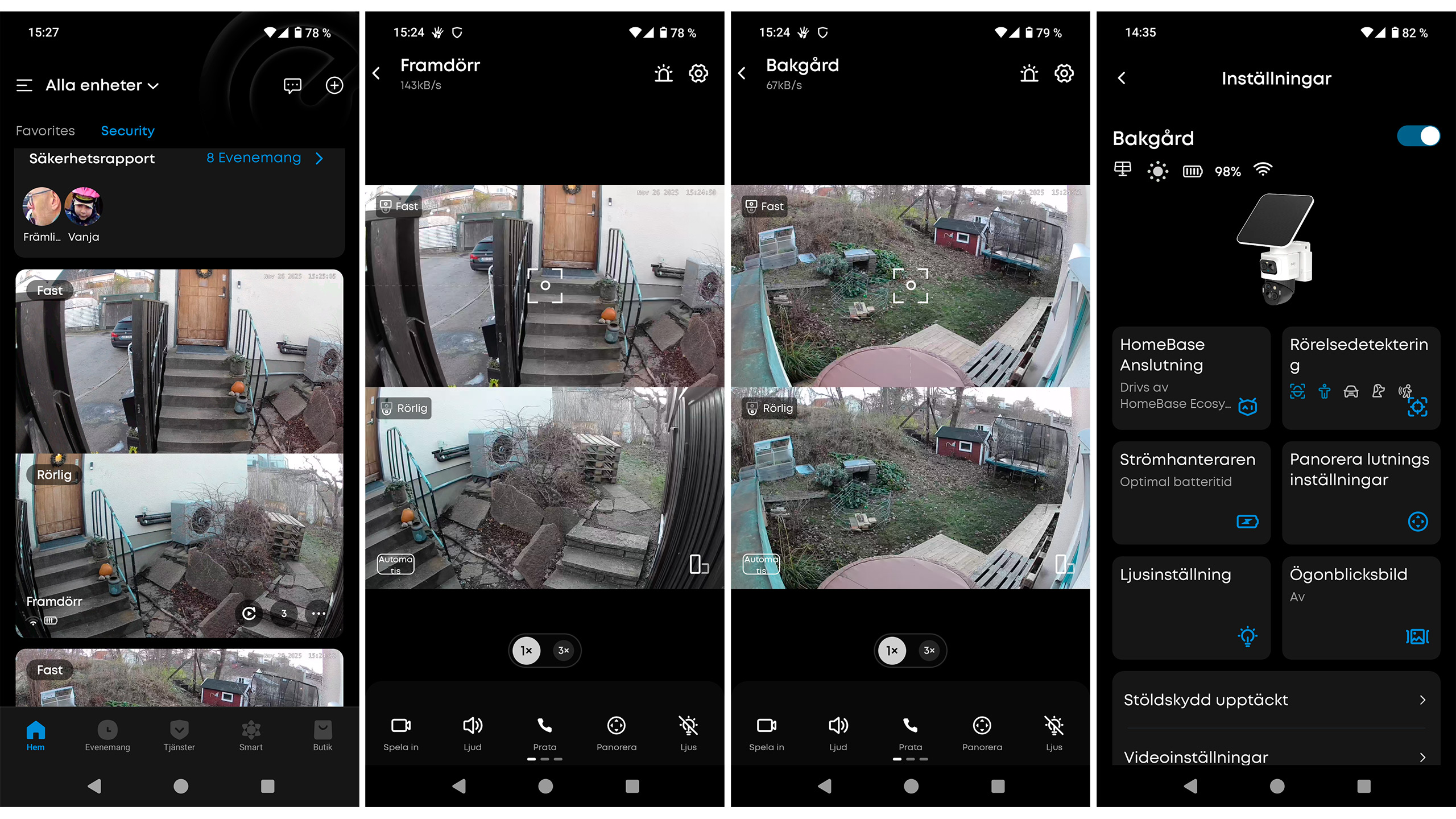 EufyCam S4 har mycket bra bildkvalitet, det gäller både den fasta kameran och den rörliga – såväl dagtid som på natten (då man kan välja att belysningen tänds och inspelningarna blir i färg eller att inga lampor tänds och inspelningarna blir i svartvitt). Till skillnad mot de flesta P&T-kameror som vi testat tidigare är det inte så lätt att på inspelningarna höra när kameran panorerar och tiltar – visst hörs det, men väldigt svagt.