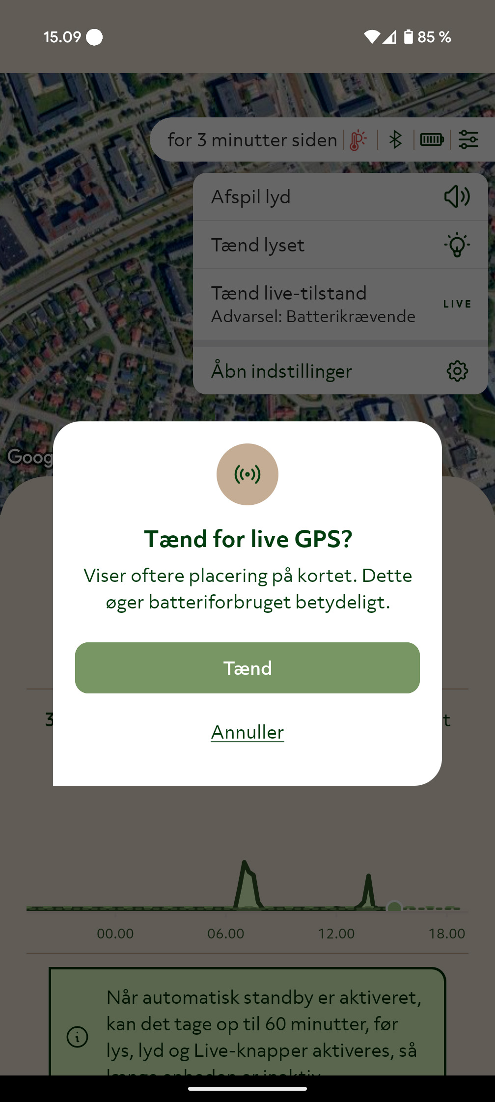 Om man däremot alltid vill veta var hobbyvargen befinner sig kan man slå på live GPS-uppdateringar. Vilket föreslås varje gång man väljer kartfunktionen. Men då sjunker batteritiden ytterligare.