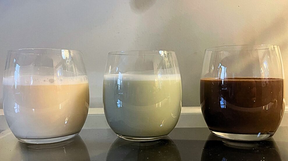 Tre nybryggda växtdrycker. Från vänster: hasselnötsmjölk med lönnsirap, mandelmjölk med matcha och mandelmjölk med kakao och dadlar (Foto: Pernille Redder)