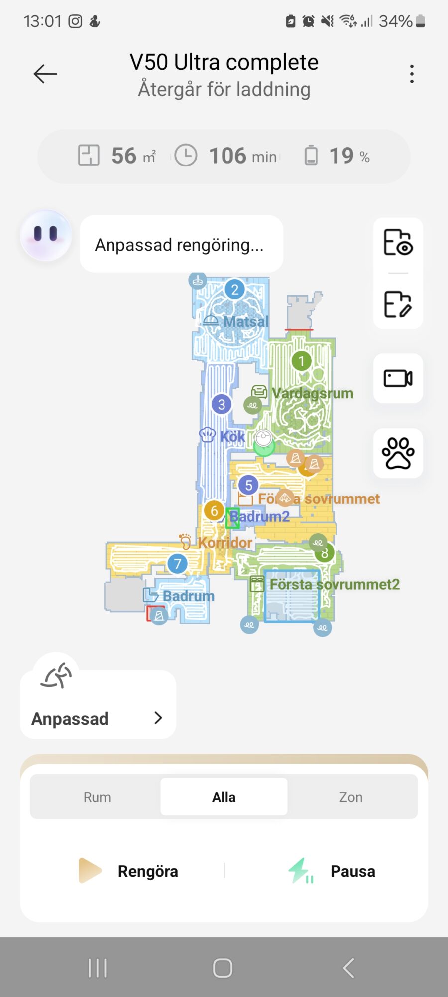 Jag märker att Mova V50 Ultra Complete ger lite extra uppmärksamhet till vissa områden i hemmet, såsom golvet i hallen och området i köket vid spisen. Katternas matskålar står kvar på samma plats som jag lämnade dem och dammsugaren kör varken in i möbler eller stolsben. Verkar som om AI-funktionerna gör sitt. Känns tryggt.