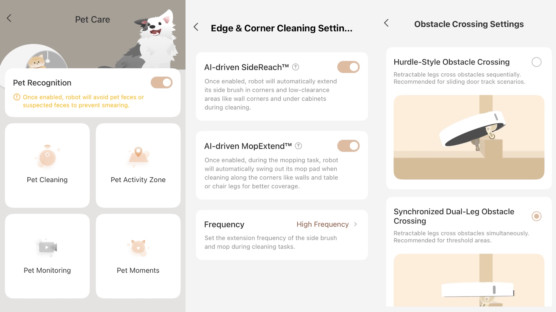 Inställningarna omfattar även AI-styrning av sidoborsten och moppen. Om mattor ska rengöras först och med extra kraft, och om roboten ska moppa i golvets riktning. Att städa längs med till exempel golvbrädor fungerar bättre när det gäller att få bort smuts i fogarna. Det skonar också golvet.