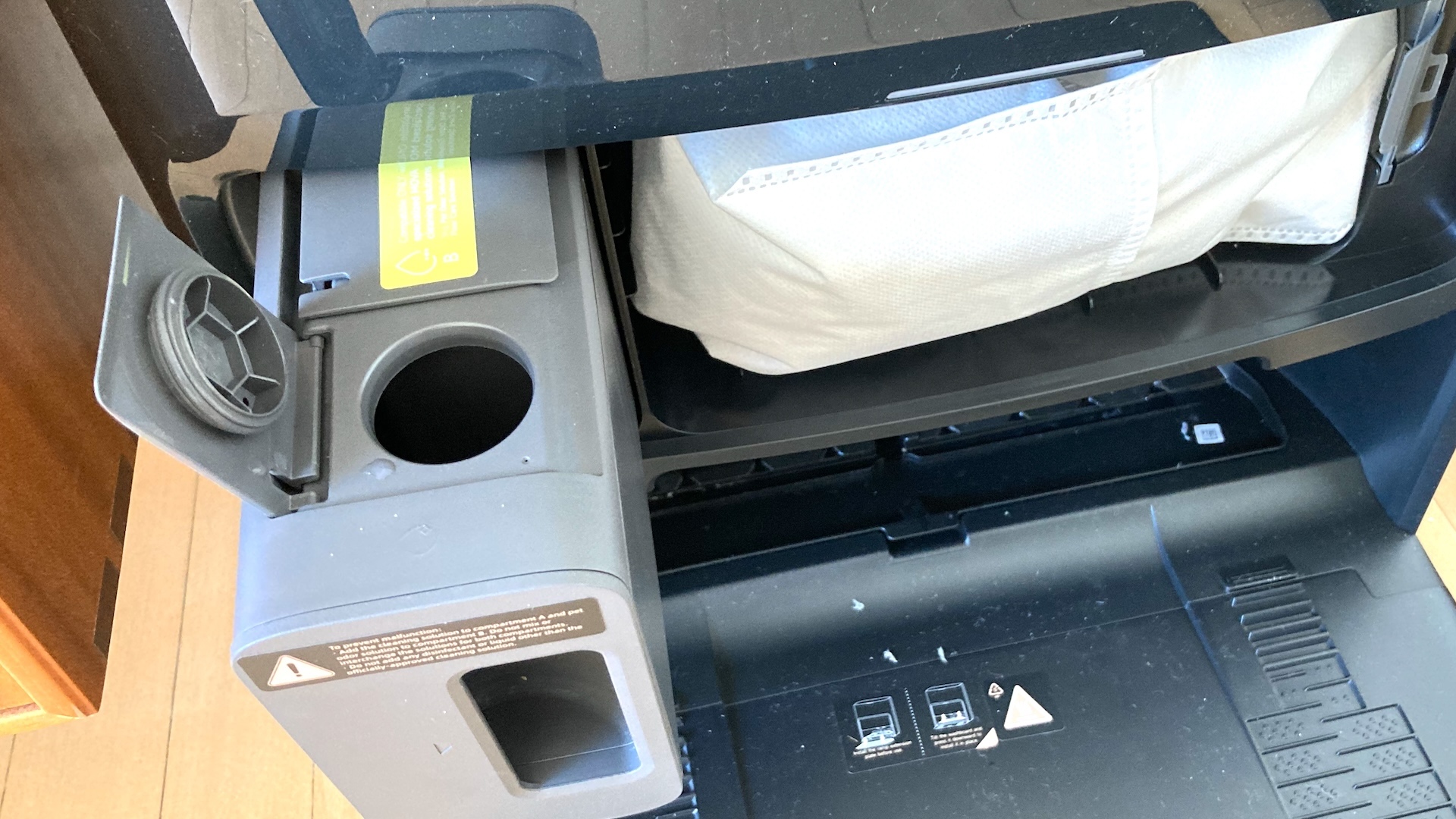 Tyvärr är locket svårt att öppna och stänga. Det känns som om det inte sitter ordentligt fast. Under locket finns en behållare med två fack på 400 ml respektive 200 ml. Det större facket är avsett för ett allroundrengöringsmedel, det andra för ett medel mot husdjursolyckor. Ja, vi pratar om illaluktande djururin på golvet.