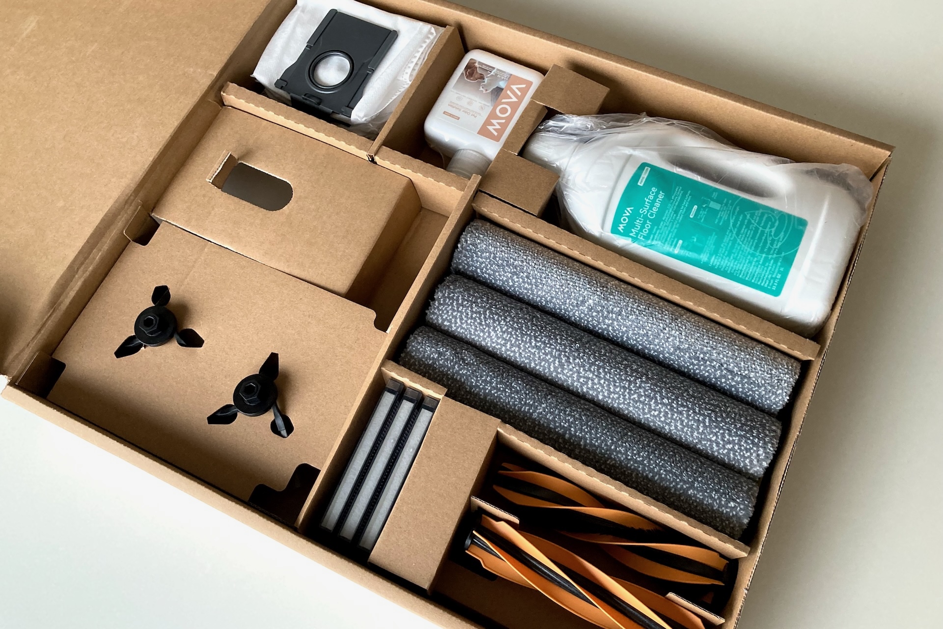 Precis som med V50 Ultra Complete har Mova skickat med en stor låda med extra tillbehör. Bland annat mopprullar, två sidoborstar och två flaskor rengöringsmedel på 200 ml (Pet Odor Solution) och 1 liter (allroundmedel).