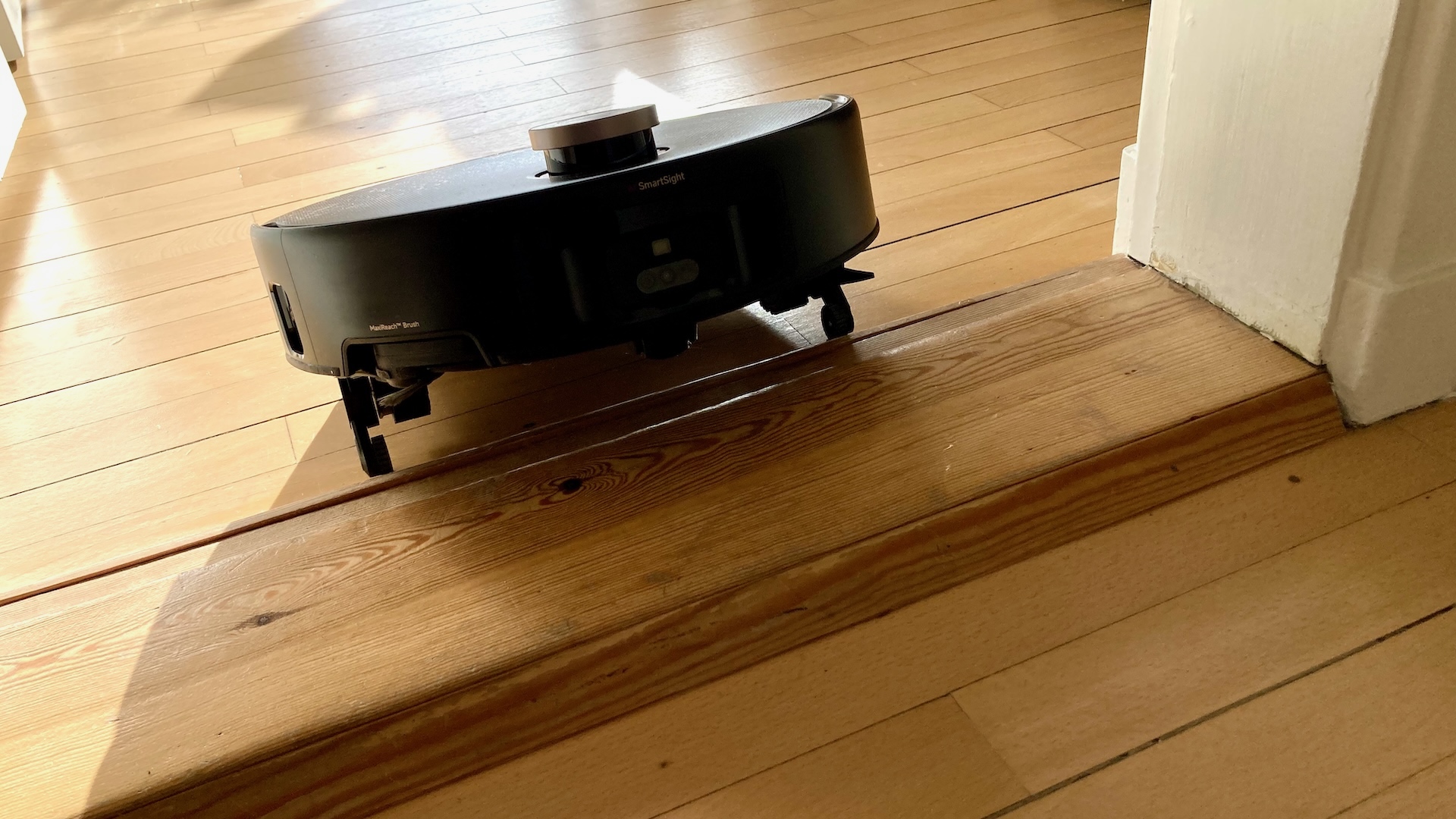 Trösklar har inte alltid samma höjd på båda sidor, så ibland lyftes roboten högt upp på ena sidan för att sedan slå i golvet på trappstegets andra sida. Det har vi upplevt med andra robotar. Bland annat Dreame X50 Ultra Complete.