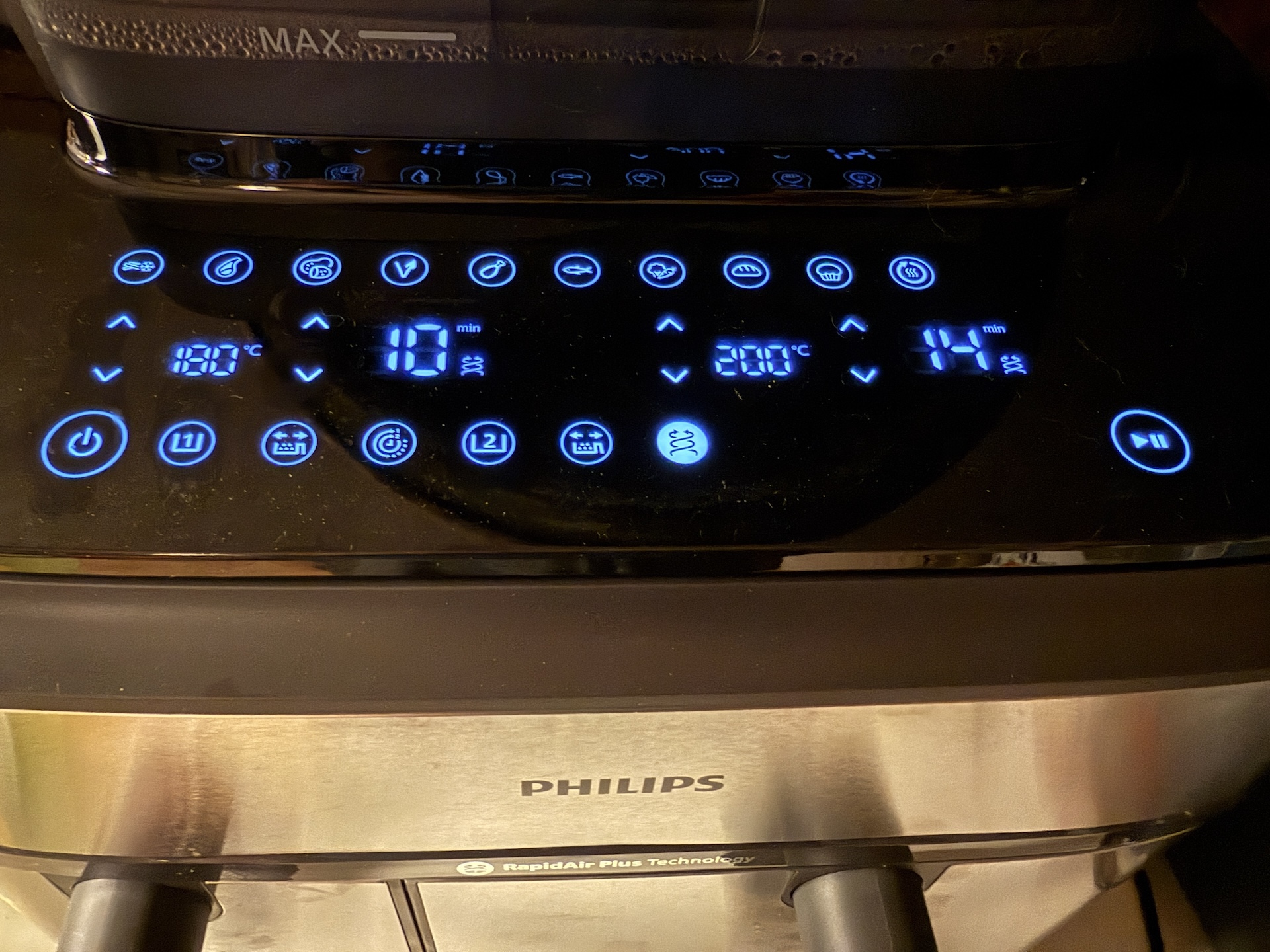 Snabbprogrammen är fryst potatis, köttskivor, veganska produkter, färsk potatis, kycklingklubbor, fisk, grönsaker, mjuka kakor, bröd och uppvärmning. Instruktionsboken har matlagningstips och tabeller för temperatur och tid för en mängd livsmedel. Om man lägger till sin airfryer i deras app, som obegripligt nog heter HomeID, så får man recept anpassade för sin modell. Även om de tråkigt nog är på engelska.