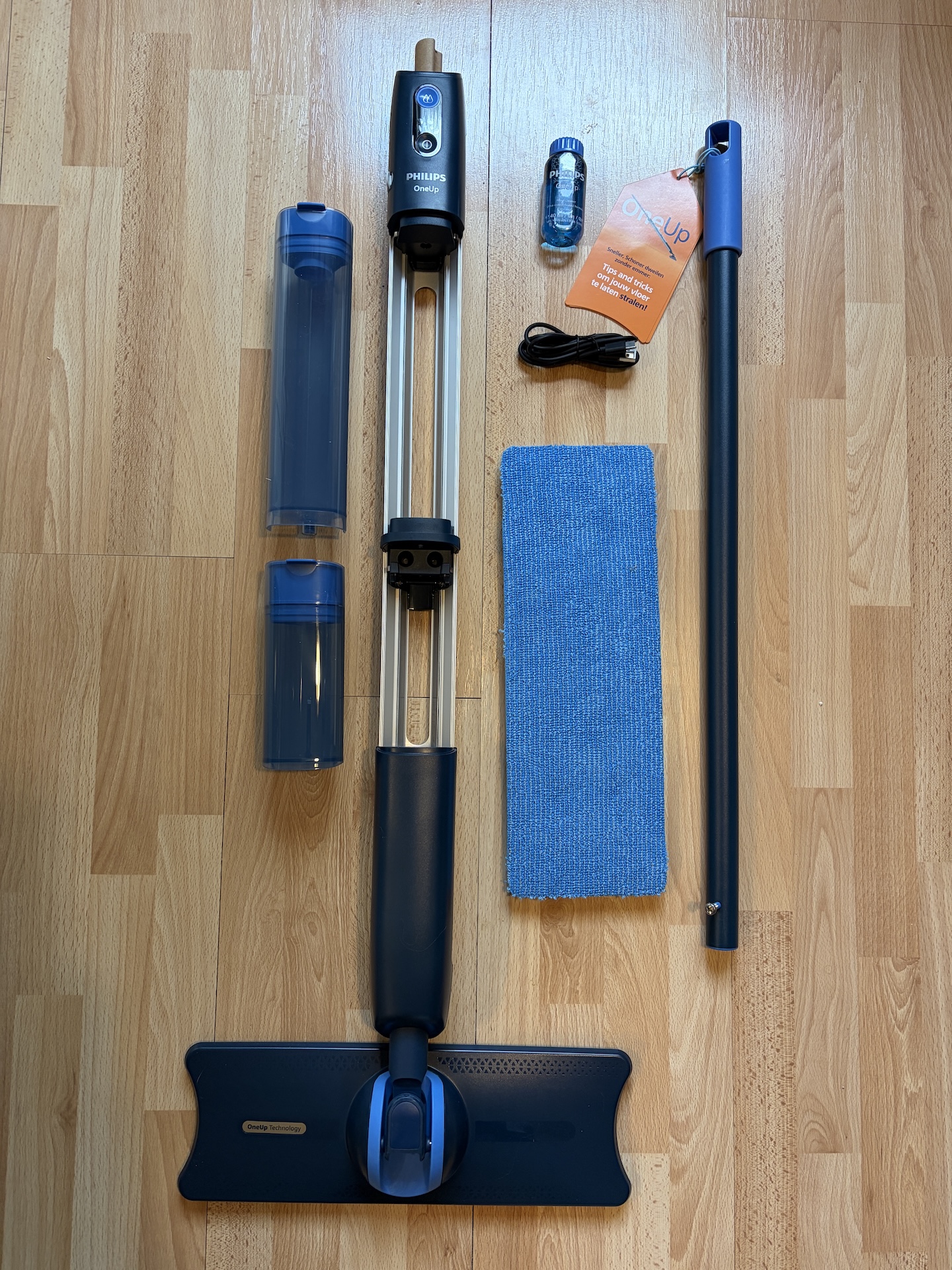 Philips Oneup ser mer eller mindre ut som de modernare mopparna med en mikrofiber-dyna längst ner. Dynan sitter på en kulled så att man kan vrida och vända på den och komma åt även i smala utrymmen. I det smala skaftet sitter två behållare. I den ena behållaren samlas smutsvattnet. Den andra är för rent vatten, där man också fäster den lilla flaskan med rengöringsmedel.