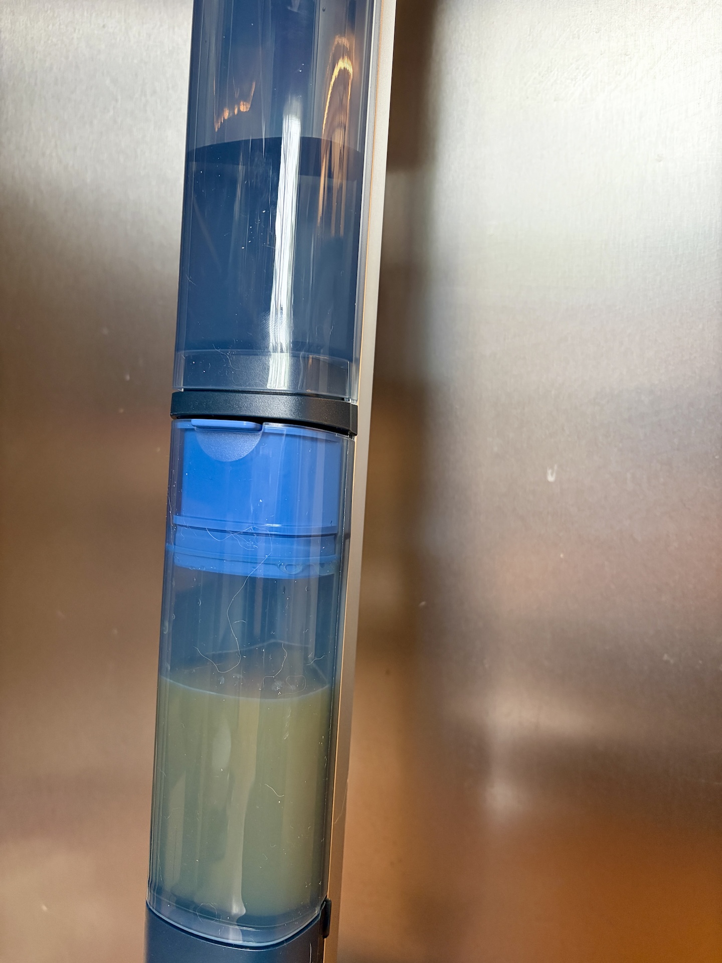 Och så kommer vi till akilleshälen för många konkurrerande produkter, nämligen att göra ren maskinen. Med Oneup lossar man på smutsvattentanken och tömmer den i slasken. Ingen gegga man måste gräva ut. Stora partiklar och hår fastnar ju i moppdynan. Och den kan man bara lossa från maskinen och skölja av under kranen. Börjar dynan kännas ofräsch är det bara att tvätta den i tvättmaskinen. Philips menar att en dyna ska hålla för ett halvårs städning.