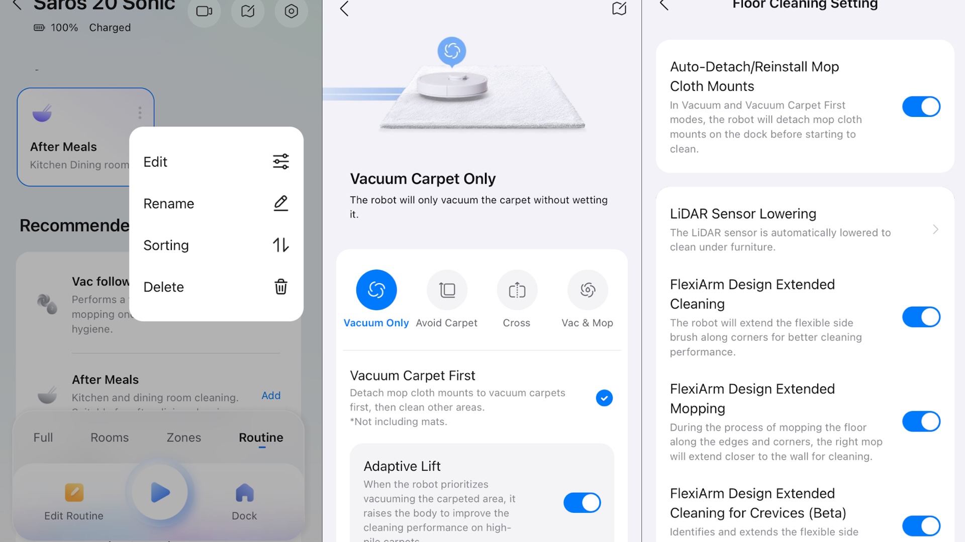 Appens många funktioner gör det möjligt att ställa in allt från husdjursdetektor till flexibel mopp och radarhus. När radarn är nedfälld kommer roboten åt där många andra modeller måste ge upp.