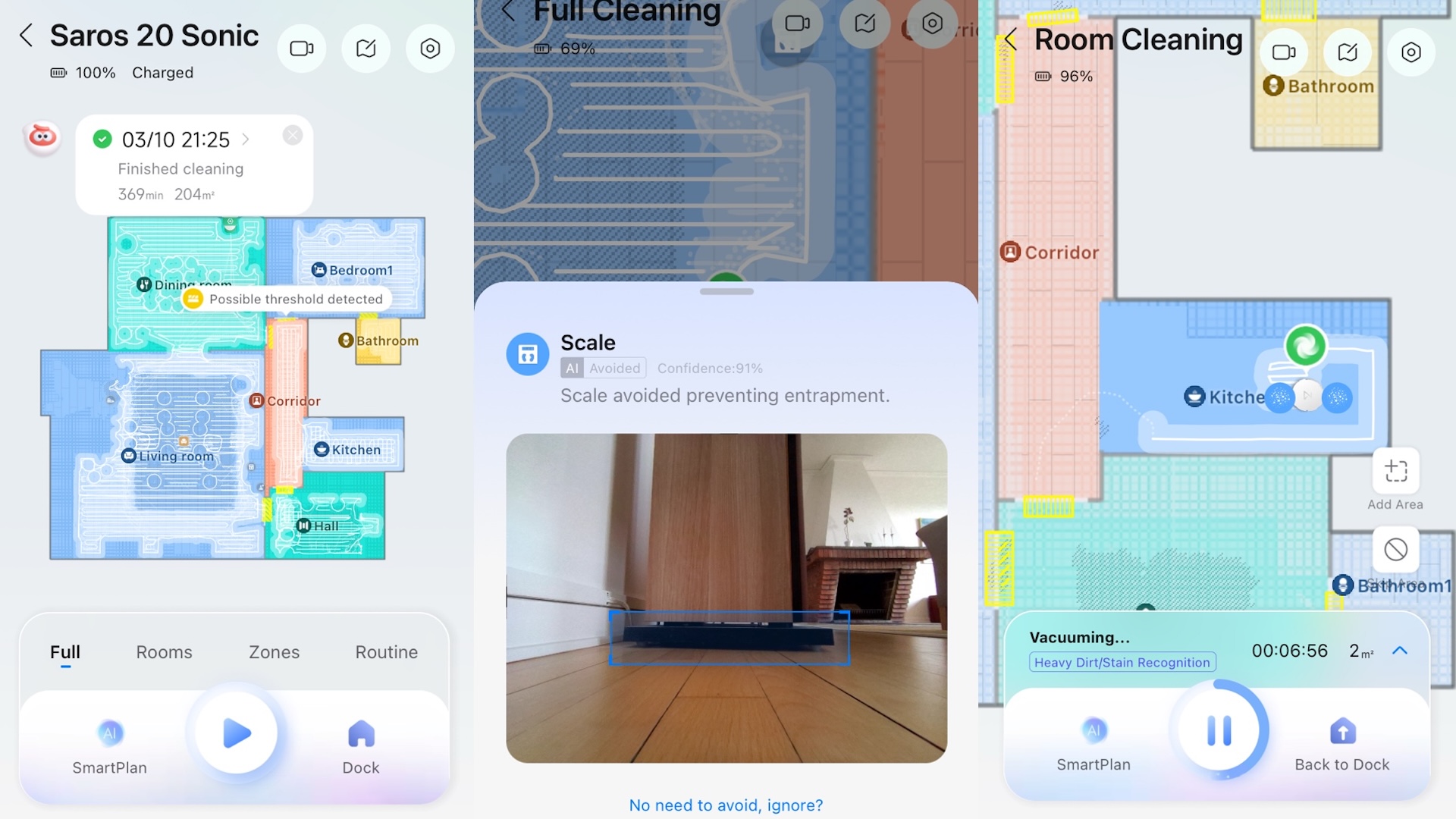 Saros 20 Sonic lokaliserar smuts, arbetar flexibelt efter omständigheterna och registrerar själv hinder och trösklar på appens karta. I andra avseenden är Saros 20 Sonic dock märkligt envis och utsätter sig nästan för självskada. Till exempel genom att ta långa omvägar och köra in i stolsben och stängda dörrar.