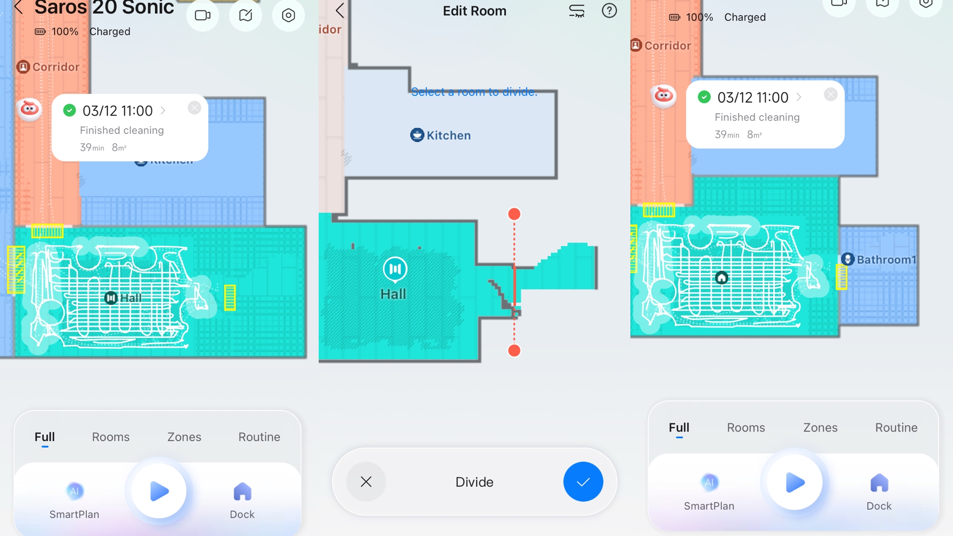 Anslutningen till hemnätverket via Roborock-appen går smidigt. Från startskärmen kan man styra städningen av hela hemmet, i rum, zoner och rutiner samt ställa in själva städningen.