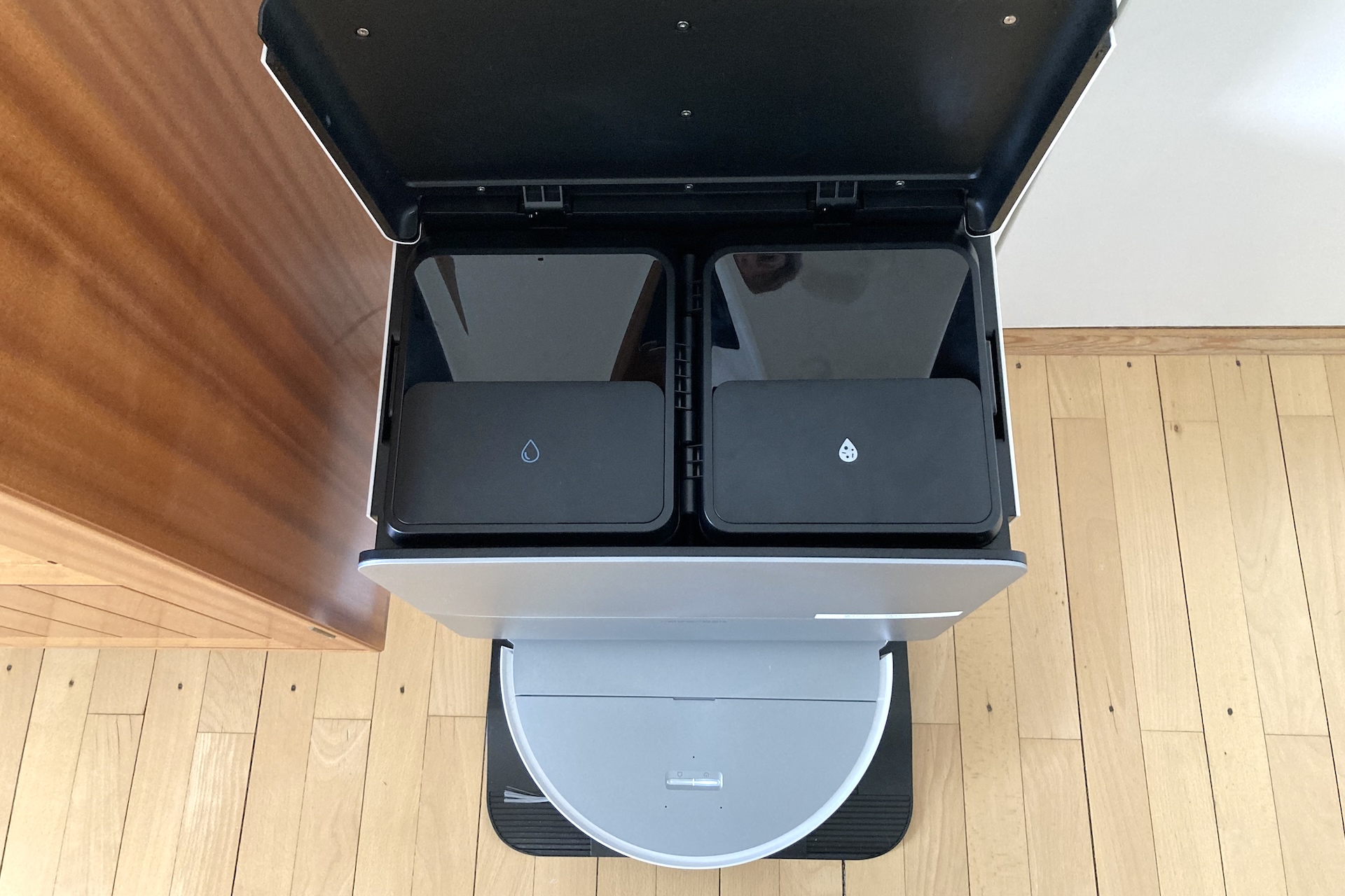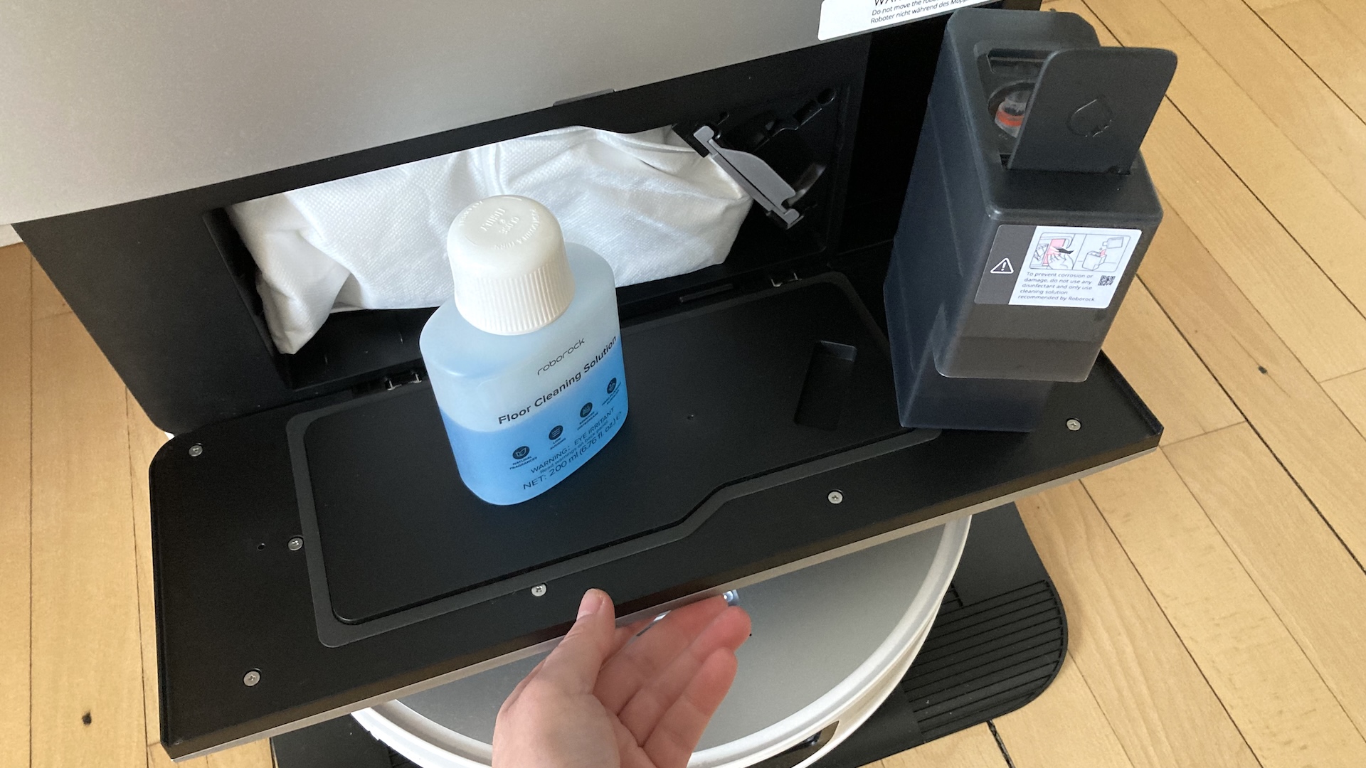 Basstationens frontlucka fälls utåt. Luckan är fäst vid basen med två fjädrande leder. De verkar anmärkningsvärt bräckliga, men fungerade utmärkt under testet. Bakom locket sitter dammpåsen på 2,7 liter och en 500 ml stor behållare för rengöringsmedel. En flaska på 200 ml medföljer tillsammans med tre extra moppkuddar, filter och dammpåsar till basen.