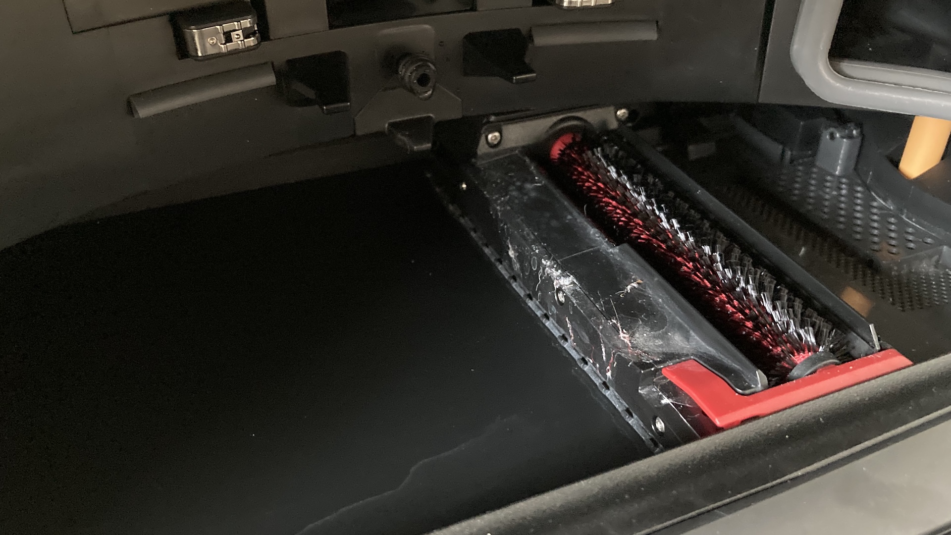 Borstarna snurrar in smutsen mot mitten, varifrån den sugs in i robotens dammkammare. Designen fungerar utmärkt, och under testet uppstod inga klumpar av damm, hår och annat skräp.