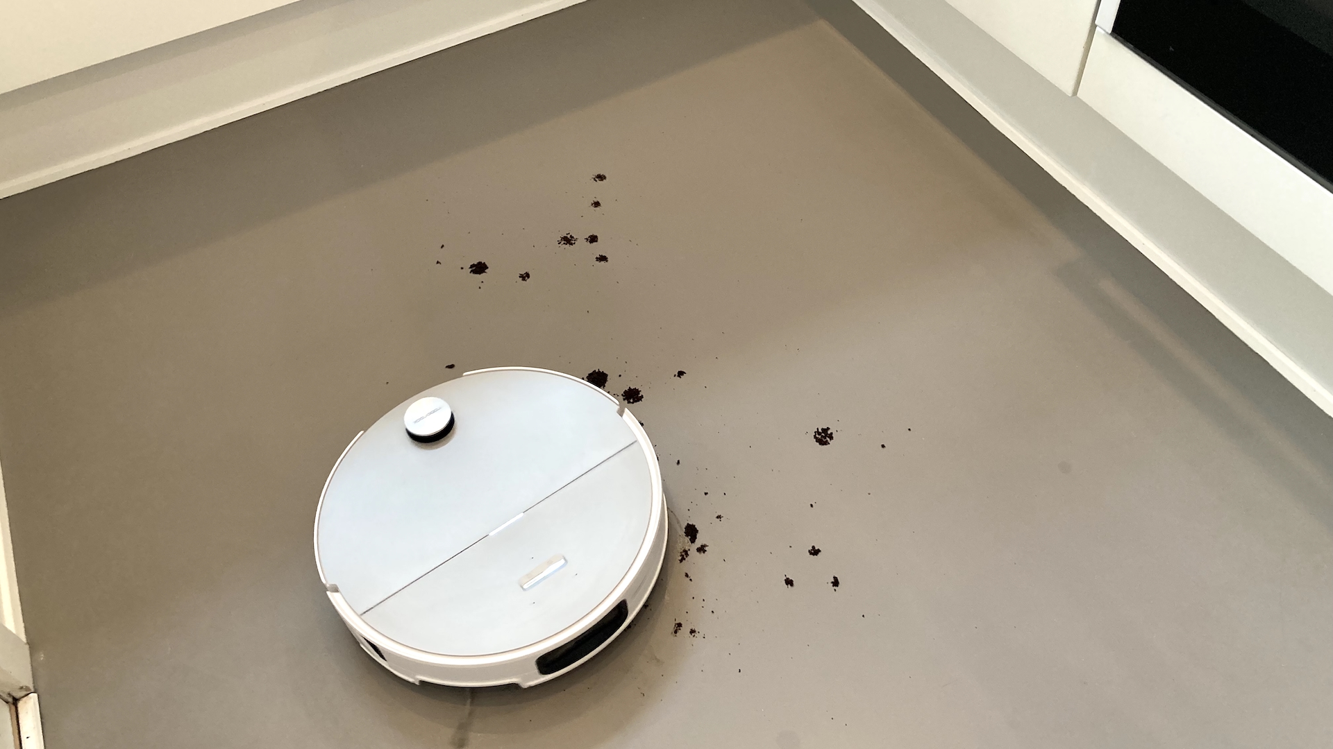 Extra smuts registreras, så att roboten anpassar sugkraften, mängden tillsatt vatten och moppkuddens vibrationshastighet. Saros 20 Sonic gav sig orädd in i striden mot kaffesumpen som strötts ut på köksgolvet och gjorde ett utmärkt jobb med att få med allt.