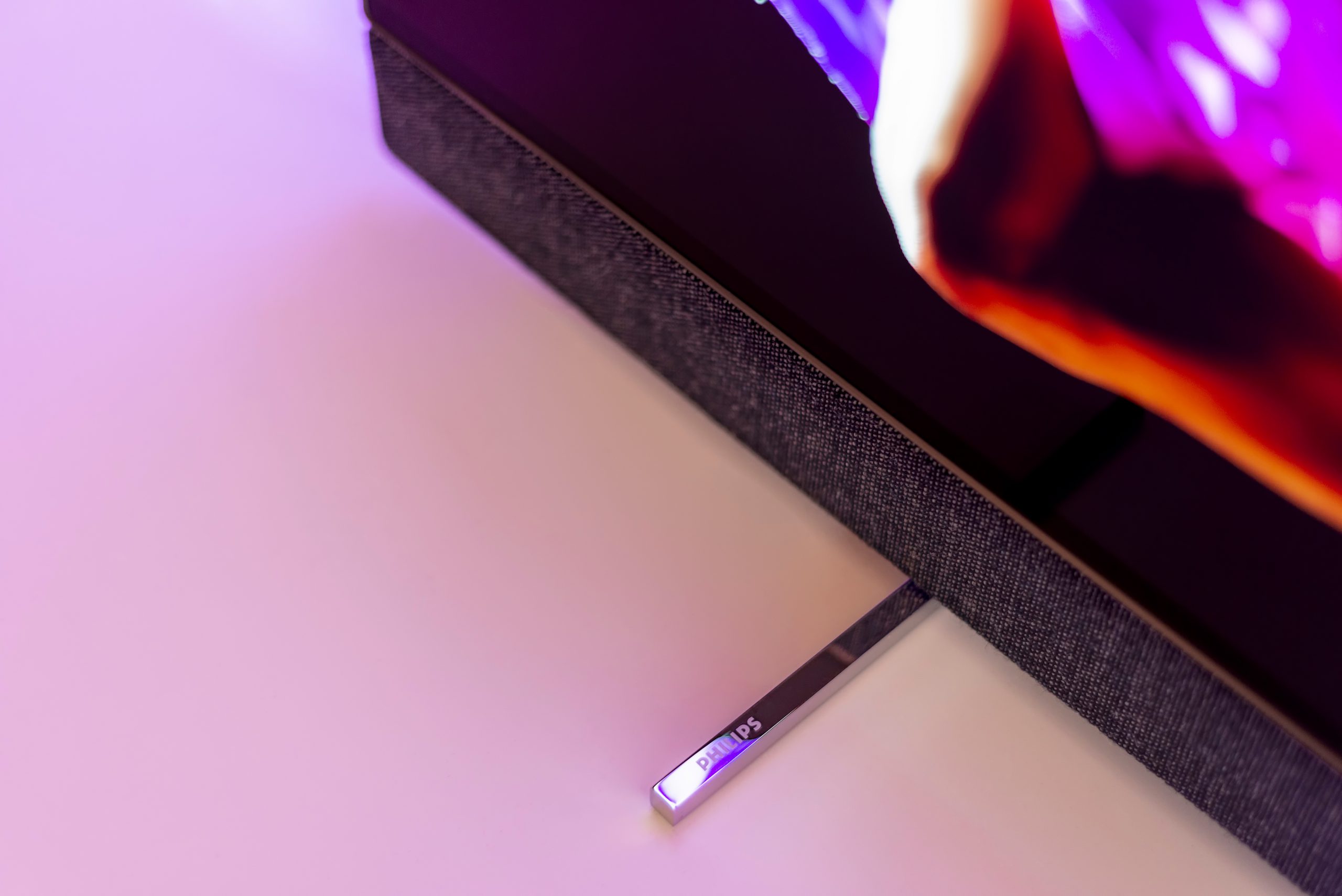 Nykomlingen är på pricken lik lillebror OLED803, med ett viktigt undantag. Rakt under skärmen sitter en kraftig, fastmonterad högtalare klädd i tyg, som går perfekt i ett med skärmens yta. Baksidan är slät och det enda som sticker ut är Ambilight-lysdioderna som lyser upp omgivningen i samma färger som skärmen. OLED-panelen är verkligen lövtunn ute vid kanterna, utan att TV:n känns bräcklig. OLED903 känns tyngre och mer solitt hopskruvad än LG:s B8- och C8-modeller.